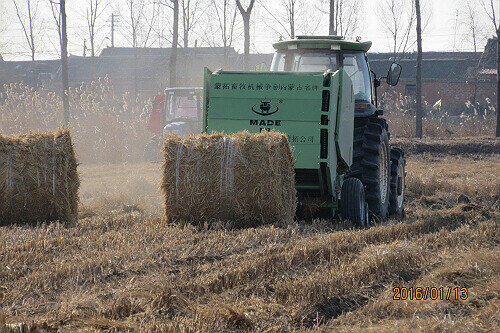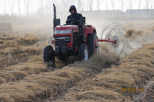 指盘式秸秆搂集机将两条水稻秸秆铺条搂集成一垄,集中摆放,提高了后续的圆捆捡拾打捆机作业效率,圆草捆直径1.25米,长1.5米,重量约300公斤。小方捆打捆机结构紧凑,转弯半径小,作业效率高,每小时作业效率为10~15亩。拖拉机牵引式和履带自走式秸秆田间转运机,行走轻松,转弯灵活。